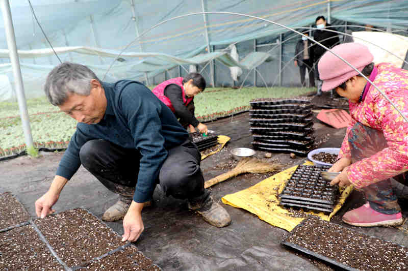 近日,正是果蔬育苗和销售的繁忙时期,在大溪河镇果蔬育苗特色产业项目——丰美种植专业合作社大棚内,一排排整齐的穴盘有序摆放,十几个工人正在有序开展点种和种苗嫁接工作。育苗区的西瓜苗、甜瓜苗有的刚从土壤里“探出头”,有的已是郁郁葱葱、绿意盎然,呈现出一派生机勃勃的动人景象。